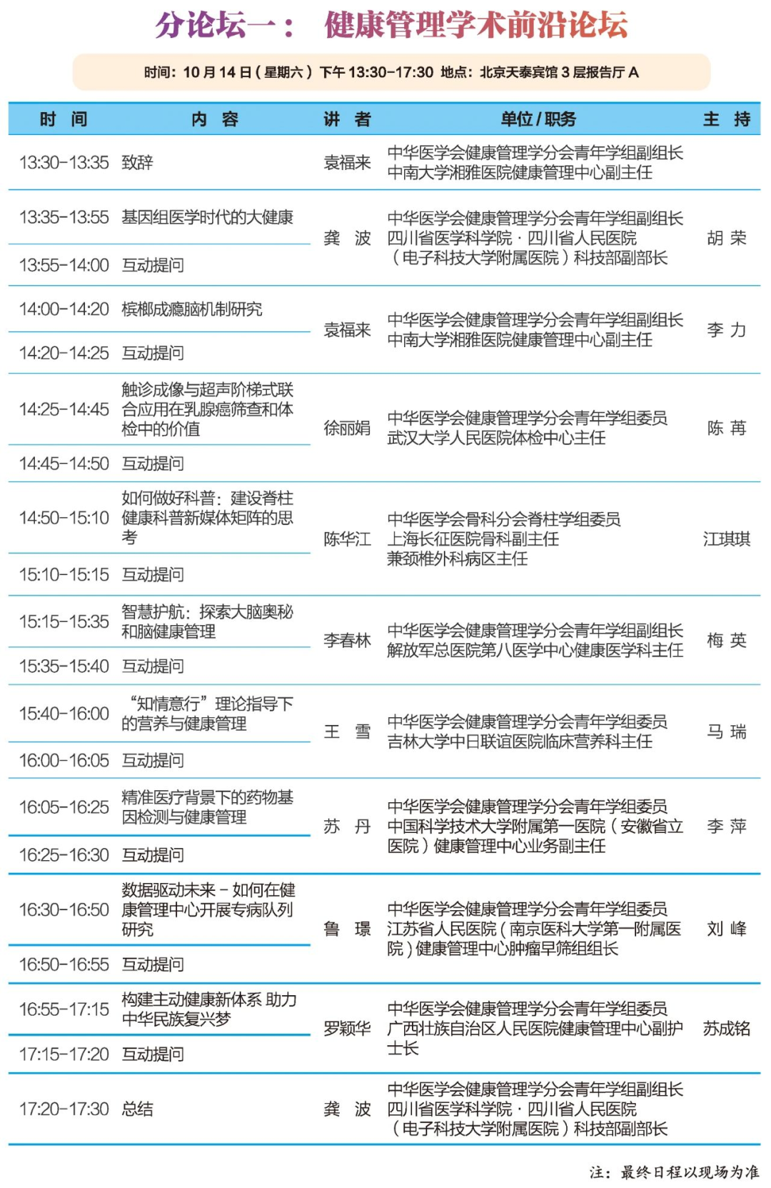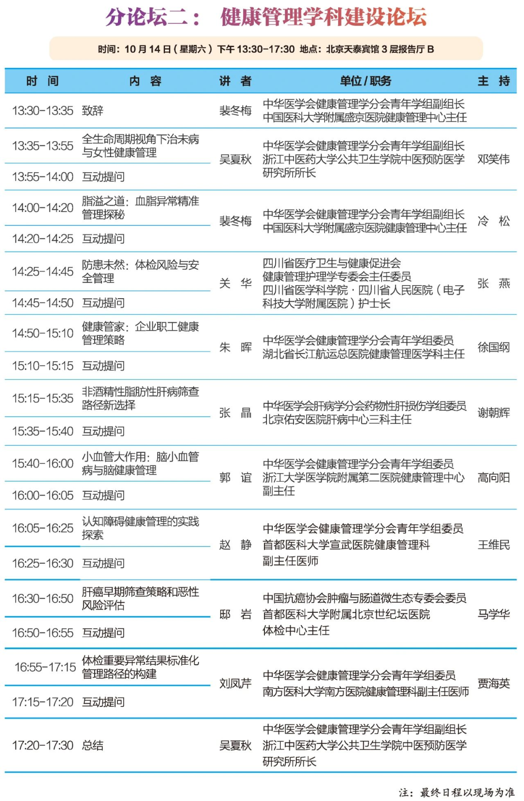 大會專題報告地點:分論壇二 ? 健康管理學科建設論壇(三層報告廳B)