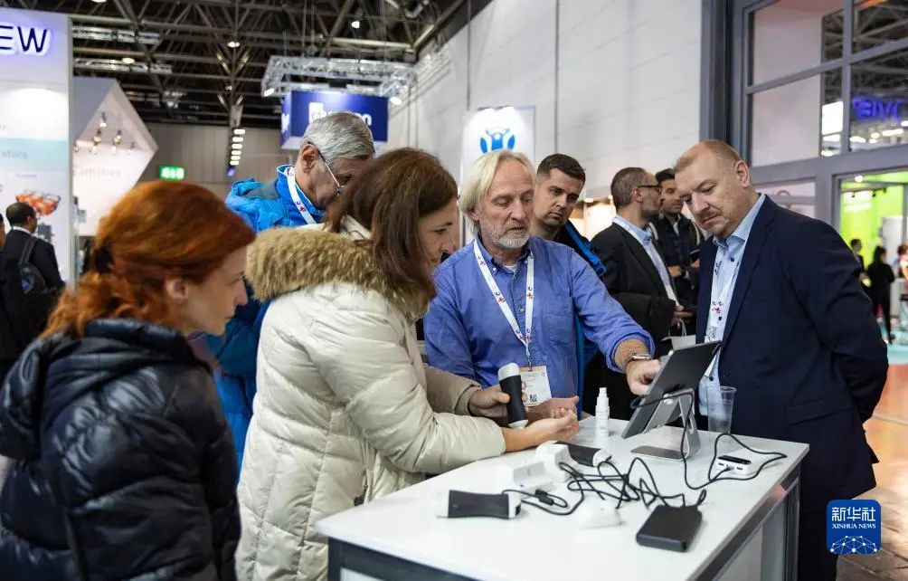 11月13日,在德國杜塞爾多夫國際醫(yī)療器械設(shè)備展,參觀者在凌特公司展位咨詢洽談。新華社記者 張帆 攝