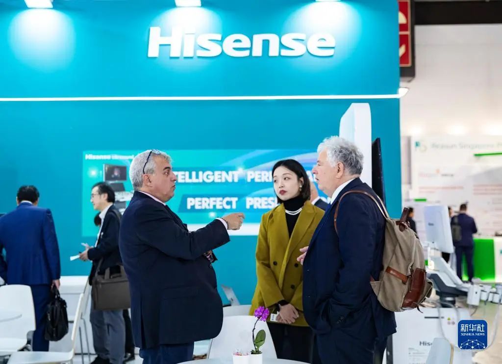 11月13日,在德國杜塞爾多夫國際醫(yī)療器械設(shè)備展,參觀者在海信醫(yī)療展位咨詢洽談。新華社記者 張帆 攝