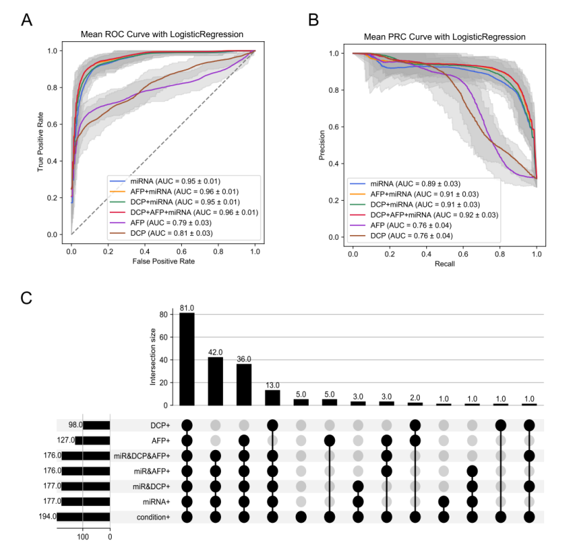 為進一步提高模型的診斷性能,我們將miRNA靶標(biāo)與AFP/DCP特征結(jié)合。結(jié)果顯示,結(jié)合后模型的ROC-AUC值提升至0.96,PRAUC值達(dá)到0.91(圖3A-B)。此外,基于該聯(lián)合特征的模型對194例HCC患者的總體靈敏度達(dá)到90.70%,顯著高于單獨使用miRNA靶標(biāo)時的88.06%(圖3C)。這表明miRNA與蛋白特征之間具有互補作用,顯著增強了HCC的診斷準(zhǔn)確性。
