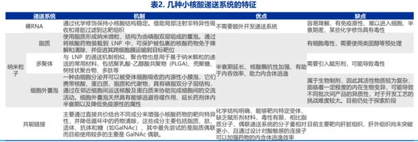 按照不同遞送技術(shù)分類,可以分為裸露RNA修飾遞送技術(shù)、脂質(zhì)體納米遞送技術(shù)、共軛連接遞送系統(tǒng)(小分子配體、抗體及其他分子)和其他多種類型的新型遞送系統(tǒng)(如多聚體納米粒遞送系統(tǒng)、細胞外囊泡遞送系統(tǒng))。其中,LNP和GaINac技術(shù)相對成熟。GaINac技術(shù)主要靶向肝臟,未來靶向其他器官的藥物遞送系統(tǒng)也有望突破,如Alnylam和 Arrowhead正在研發(fā)的針對中樞神經(jīng)系統(tǒng)、眼睛、腎癌細胞與肺上皮細胞等遞送系統(tǒng)。