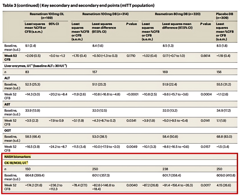 在接受Resmetirom不同劑量的治療組中,CK18的下降幅度顯著高于傳統(tǒng)肝功能標志物[2]