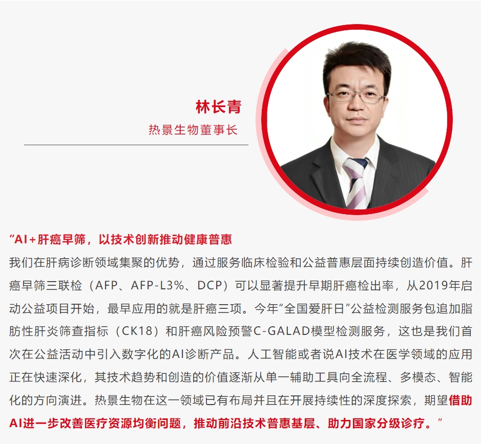 3月18日,值第25個“全國愛肝日”期間,“2025肝癌防治健康中國行——全國愛肝日”大型公益義診活動在全國30省份近百家醫(yī)院的協同下聯合展開,惠及近萬人次,公益健康服務包(肝癌三項、GP73、CK18-M30/M65等)由熱景生物支持。2025年升級版“肝病全周期健康檢測服務包”首次融合數智化AI診斷模型,探索“AI+創(chuàng)新診療”公益新模式,通過智能算法提升肝癌篩查效益,助力實現"篩查-診斷-干預"全流程精準管理,全面推動肝癌防治邁入數智化新階段。
