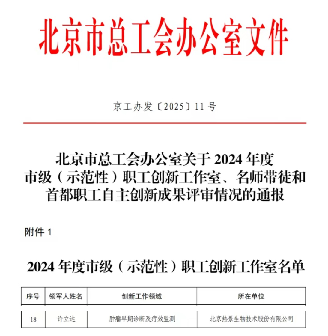 近日,北京市總工會發(fā)布《關(guān)于2024年度市級(示范性)職工創(chuàng)新工作室、名師帶徒和首都職工自主創(chuàng)新成果評審情況的通報》,熱景生物許立達研究員領(lǐng)軍的“腫瘤早期診斷及療效監(jiān)測”創(chuàng)新團隊榮獲“北京市級職工創(chuàng)新工作室”稱號,該稱號是對工作室在腫瘤精準診斷領(lǐng)域持續(xù)創(chuàng)新與技術(shù)轉(zhuǎn)化卓越貢獻的權(quán)威認可。創(chuàng)新驅(qū)動腫瘤診斷革新該工作室專注于腫瘤早期診斷與療效監(jiān)測技術(shù)的研發(fā),依托公司核心原創(chuàng)技術(shù),成功搭建起獨具特色的多組學(xué)診斷技術(shù)平臺,實現(xiàn)外泌體、蛋白、核酸等腫瘤標志物從發(fā)現(xiàn)到臨床轉(zhuǎn)化的貫通,助力腫瘤精準診療。
