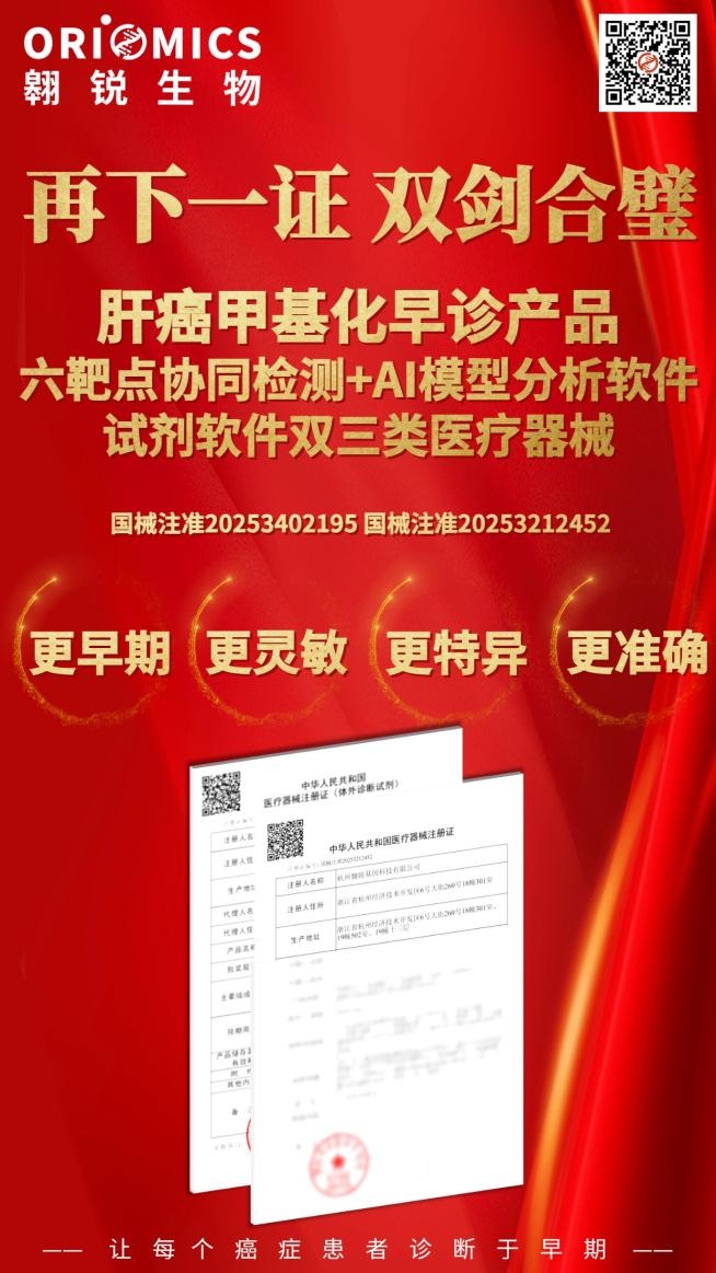 12月1日,熱景生物重要參股公司翱銳生物研發(fā)的“TSPYL5、RASSF1A、DAB2IP、OTX1、PTPN18、HIST1H3G基因甲基化AI模型分析軟件”成功獲得中國國家藥品監(jiān)督管理局(NMPA)三類醫(yī)療器械注冊證。這是繼2025年10月“利為平?——肝癌甲基化六靶點協(xié)同檢測試劑盒獲批后,翱銳生物在30天內拿下的第二張“三類證”。自此,翱銳生物已形成“檢測試劑+AI分析軟件”雙Ⅲ類證的完整產品組合,標志著公司在肝癌早診早篩領域的產品布局進入“精準診斷”與“智能分析”深度融合的全新階段。